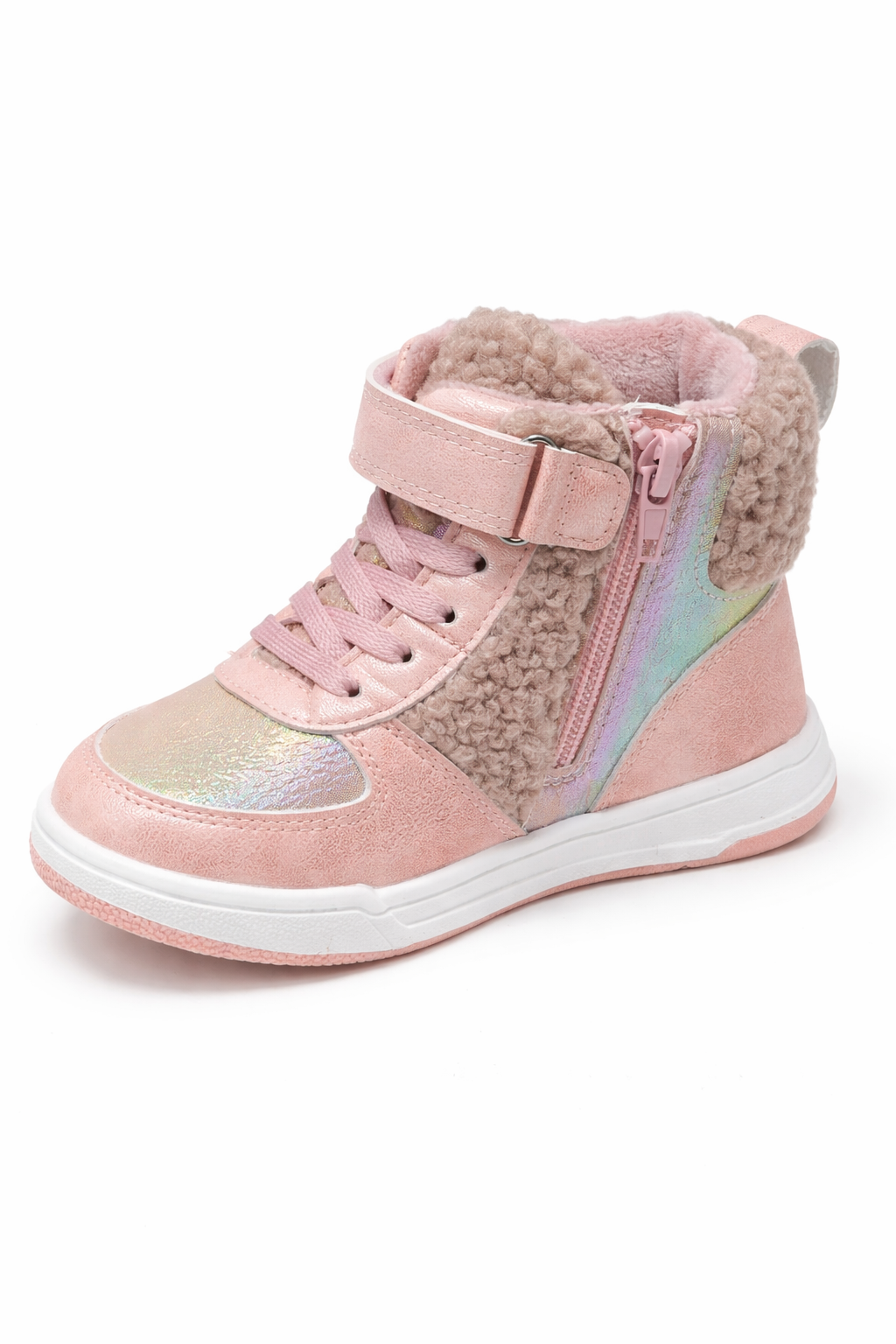 The front features a subtle iridescent shimmer panel that adds a playful shine, while the side zipper makes them easy to wear for kids. The adjustable Velcro strap and lace-up design ensure a firm fit, perfect for active daily use.