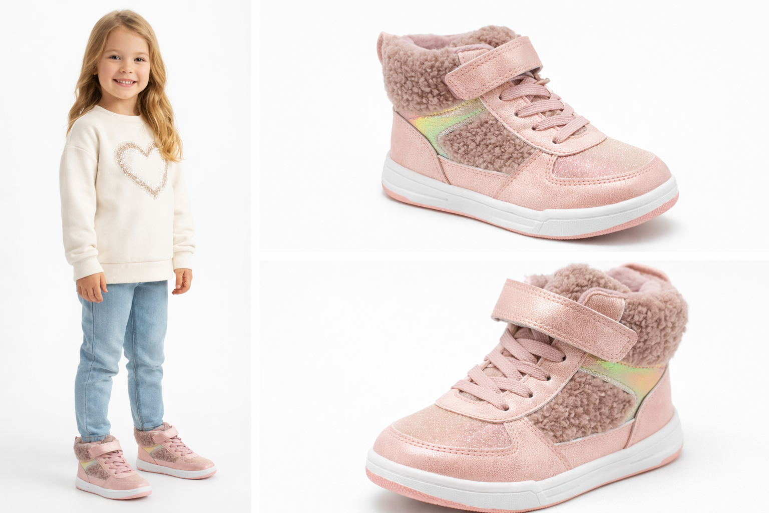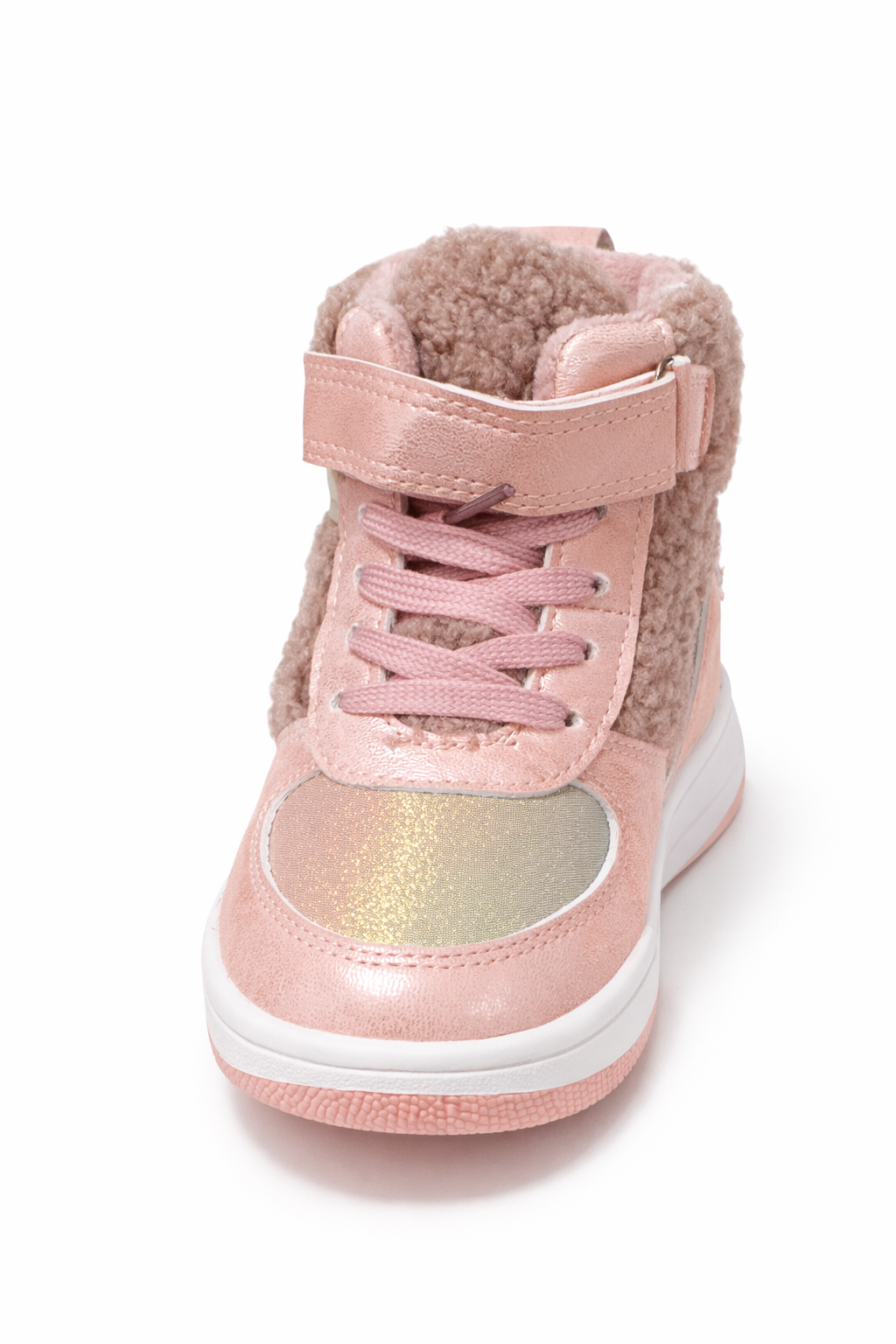 These stylish girls’ high-top sneakers are designed to keep little feet warm, comfortable, and secure during cold days. Made with a soft pink synthetic leather finish and a cozy faux-fur lining, they combine winter protection with a cute, modern look.