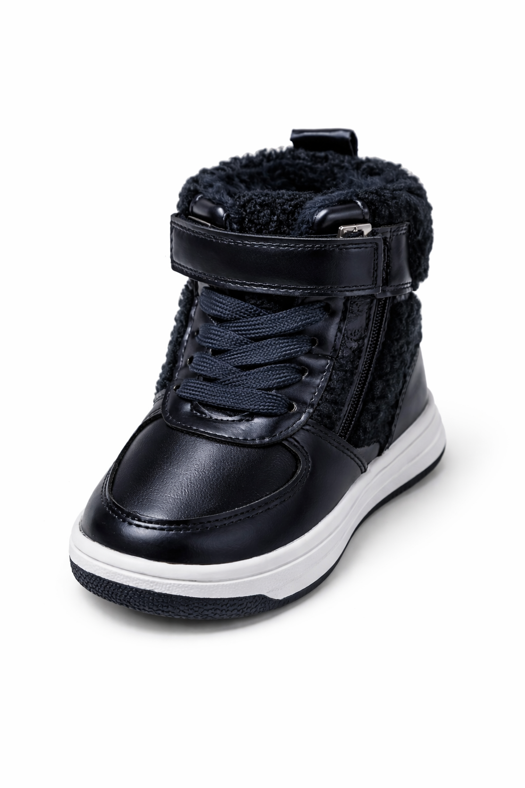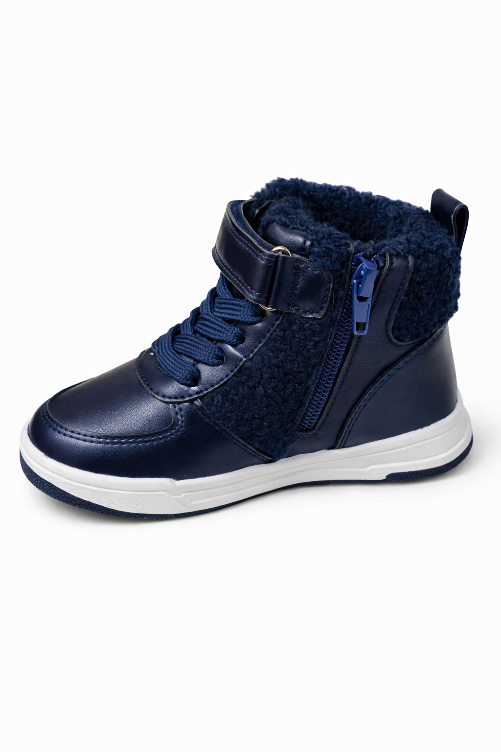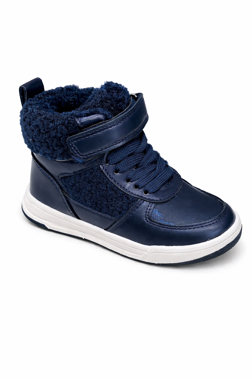 These kids blue winter high-top shoes are designed to keep little feet warm, secure, and comfortable during cold days. Made with a durable synthetic leather upper and a soft faux-fur inner lining, they provide excellent insulation without being heavy.