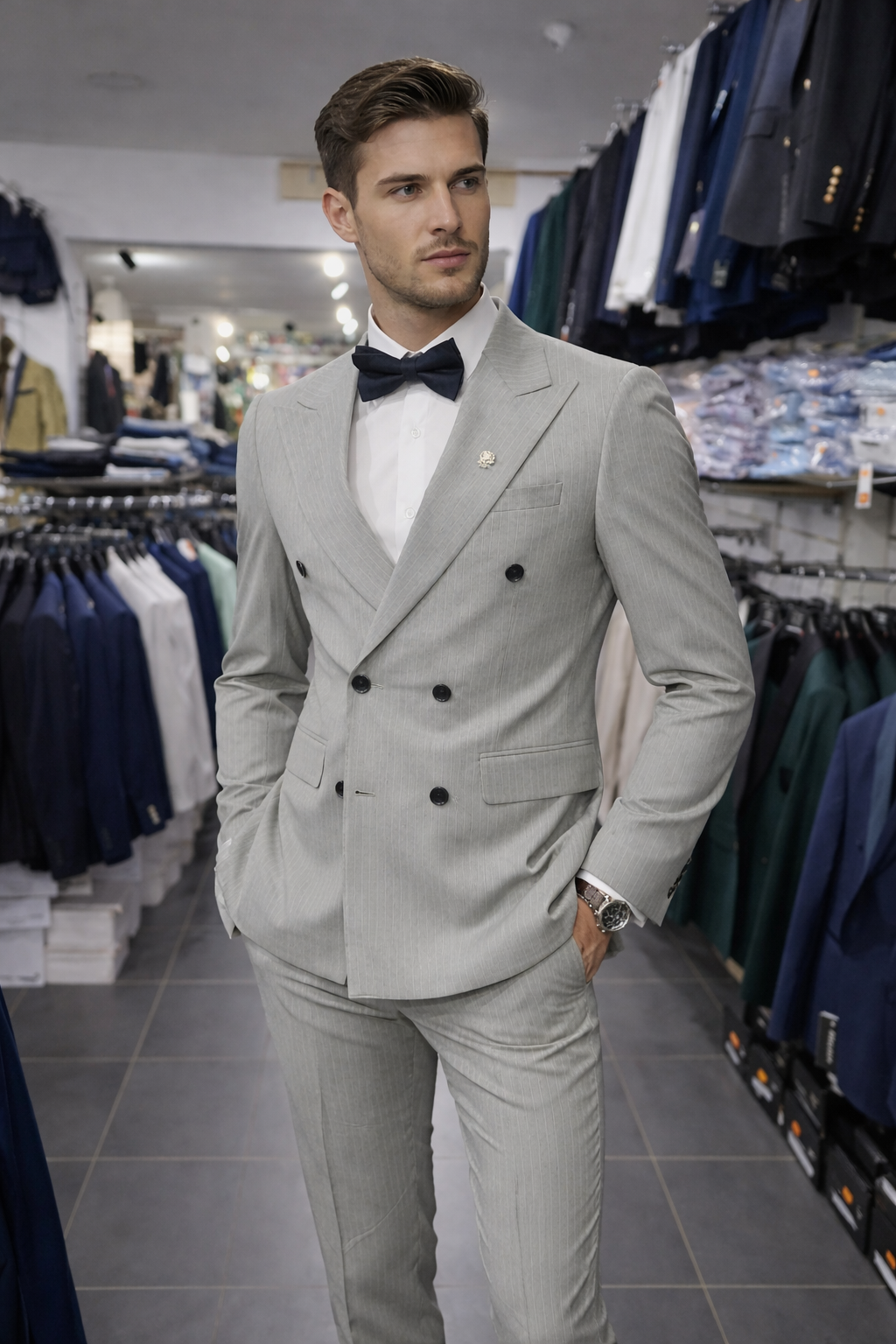 The sharp double-breasted cut enhances posture and confidence, while the slim-fit tailoring delivers a modern European look. The neutral grey tone makes it versatile — easy to style with a bow tie or classic tie depending on the occasion.