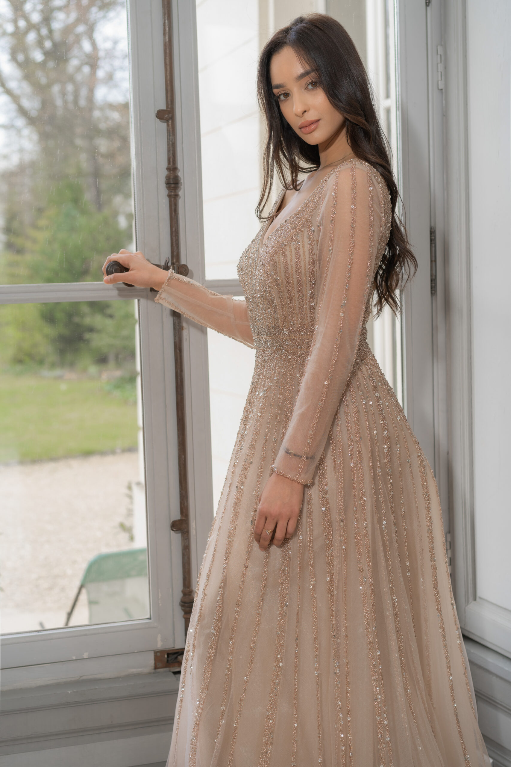Step into your fairy tale moment with the Royal Sparkle Tulle Wedding Gown  — a masterpiece of elegance designed for the modern bride who desires classic romance. Crafted from 100% premium polyester, this gown features a flattering A-line silhouette, a deep yet modest V-neckline, and long sheer sleeves adorned with subtle shimmer. The glittering embellishments cascade across the gown, adding a magical glow to your every step.