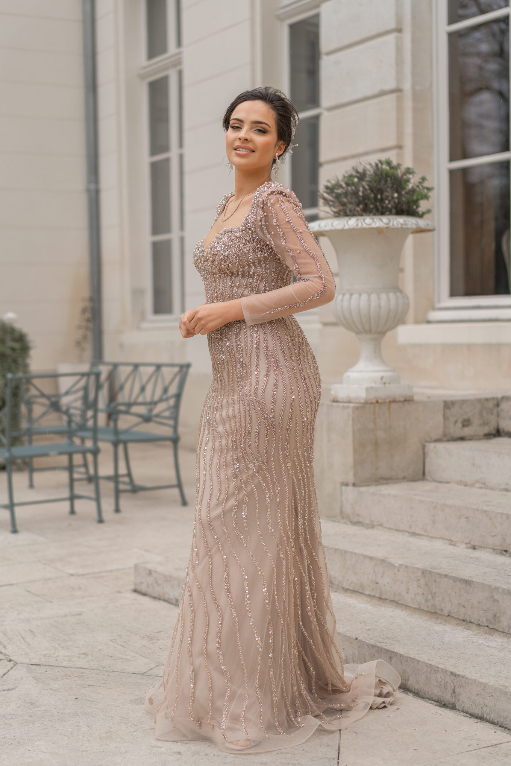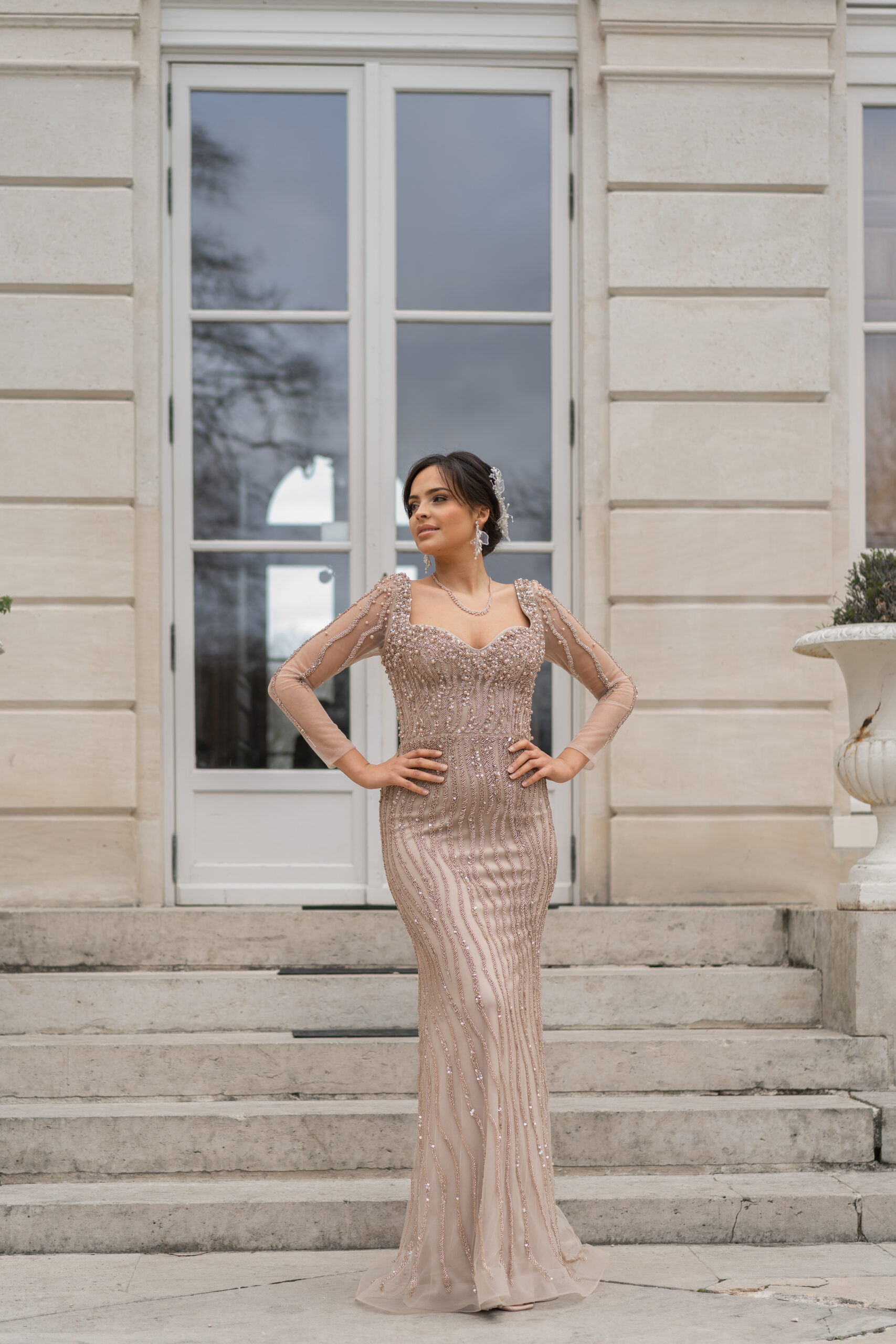 With sheer long sleeves and a delicately ruched bodice, the design emphasizes both elegance and femininity. The soft Champagne color adds a touch of romantic charm, making it perfect for bridesmaids, receptions, red carpet moments, or formal galas.