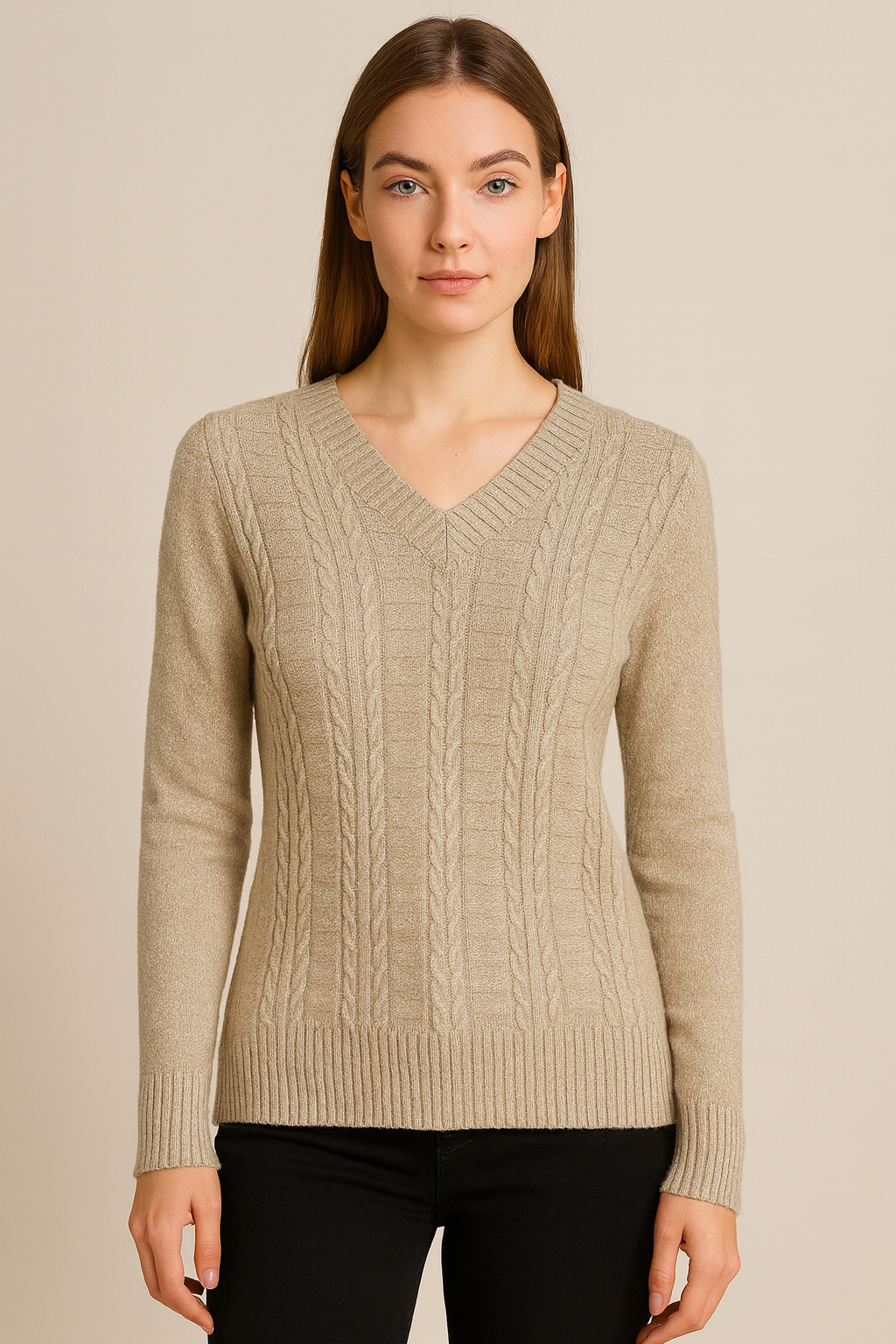Soft and elegant beige cable-knit sweater with a flattering V-neckline. Warm, stretchy, and perfect for everyday wear.