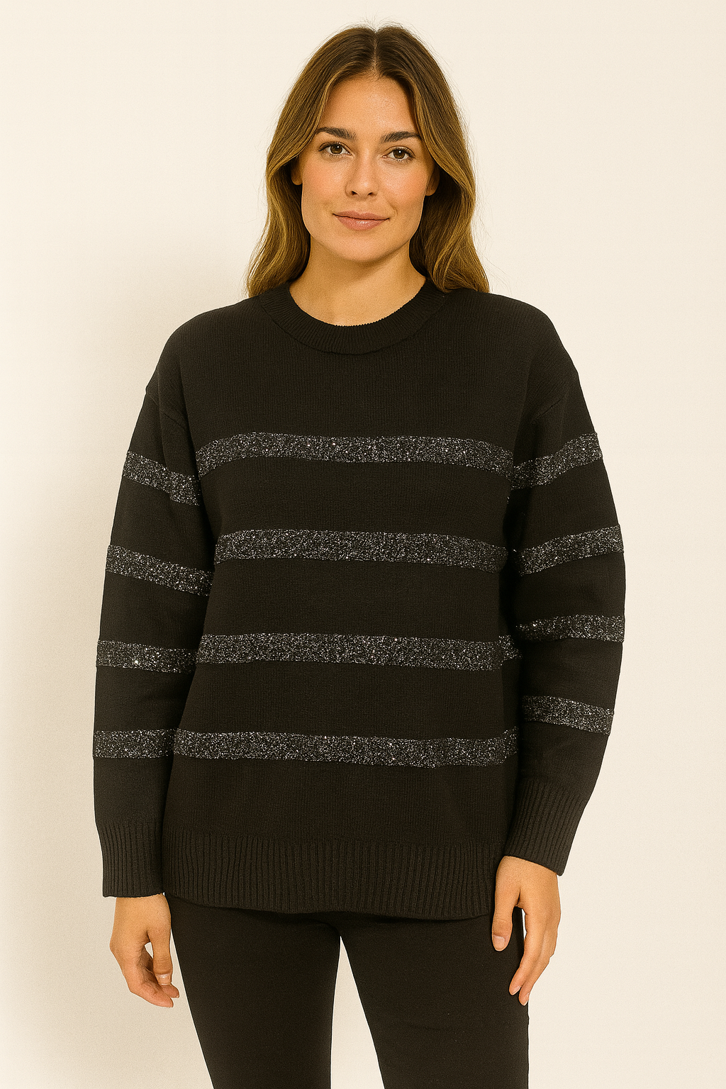 Add a touch of sparkle to your winter wardrobe with this beautiful black knit sweater. Designed with soft, warm fabric and subtle horizontal glitter stripes, it gives a stylish shine without being too bold. The relaxed cut offers comfort for everyday wear while keeping a chic, modern look.