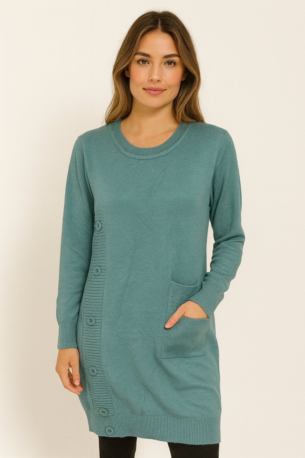 This elegant teal long knit tunic brings comfort and style together. Made from soft, stretchy knit fabric, it features a unique asymmetric side-button design, adding a modern touch to a classic winter piece. The front pocket gives practicality and a casual look, making it easy to wear for daily outings, work, or relaxed weekends.